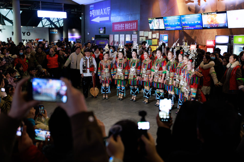 2025年2月25日,电影《哪吒2》上映期间,演员在贵州贵阳一家影城表演侗族大歌。