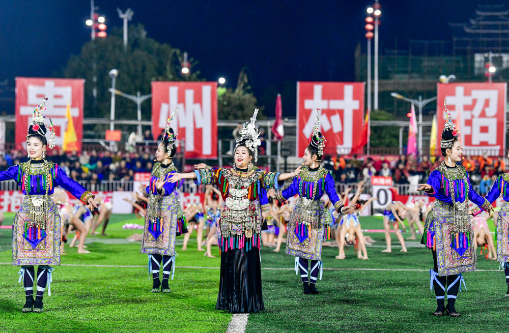 2025年3月14日,2025年贵州“村超”40强交叉赛在榕江“村超”足球场举行,演员在比赛间隙表演侗族大歌,民族文化伴随着体育赛事成功“出圈”。