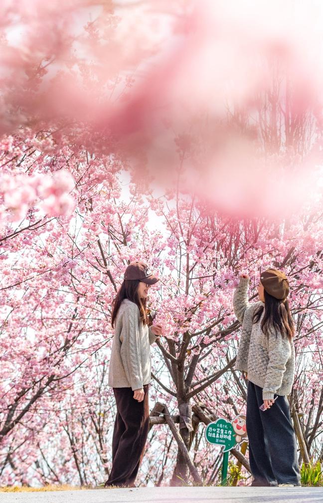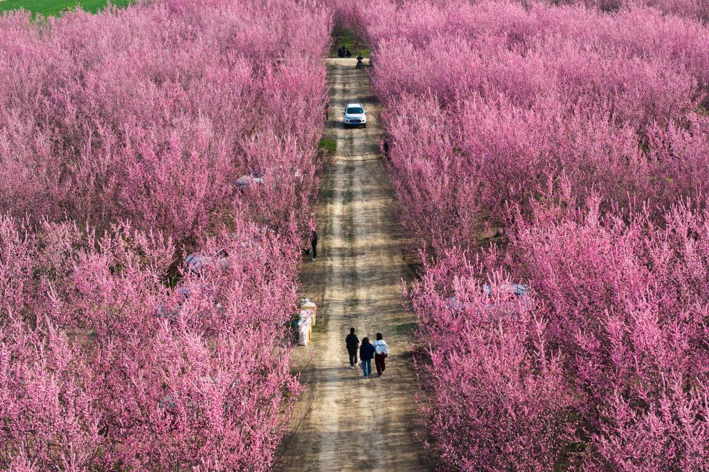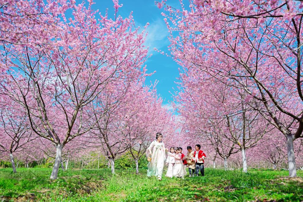 3月21日,游客在安徽省滁州市全椒县马厂镇龙山樱花园踏青游玩。新华社发(计成军摄)