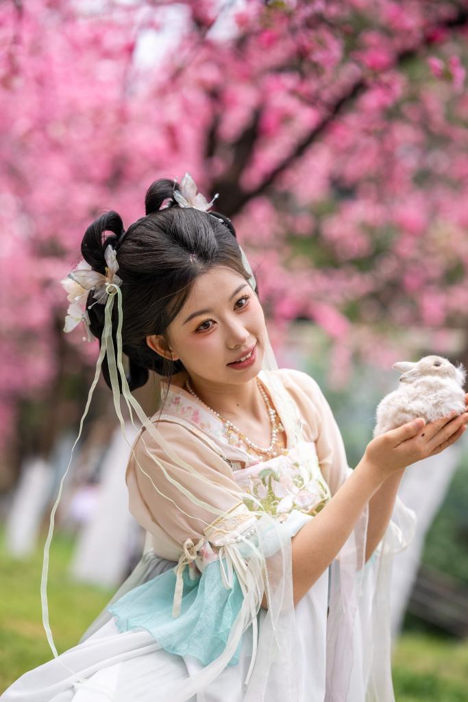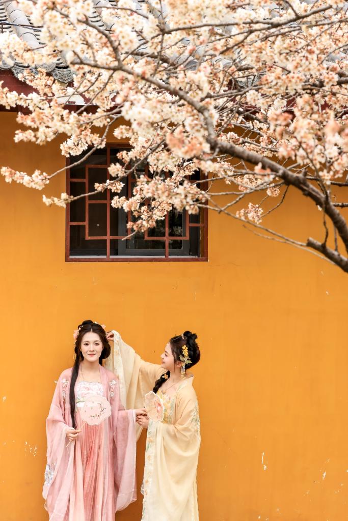3月11日,游人身着汉服在湖北省武汉市龙华寺景区赏花拍照。 新华社发(赵军摄)