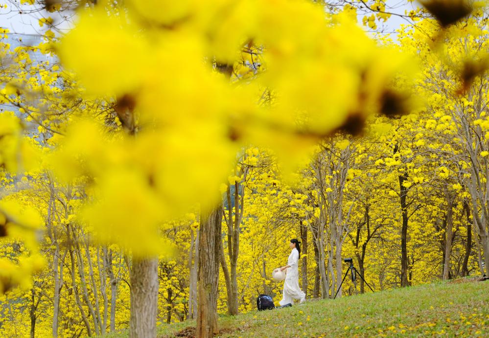 3月14日,游客在广西南宁市青秀山风景区观赏黄花风铃木。新华社记者 周华 摄