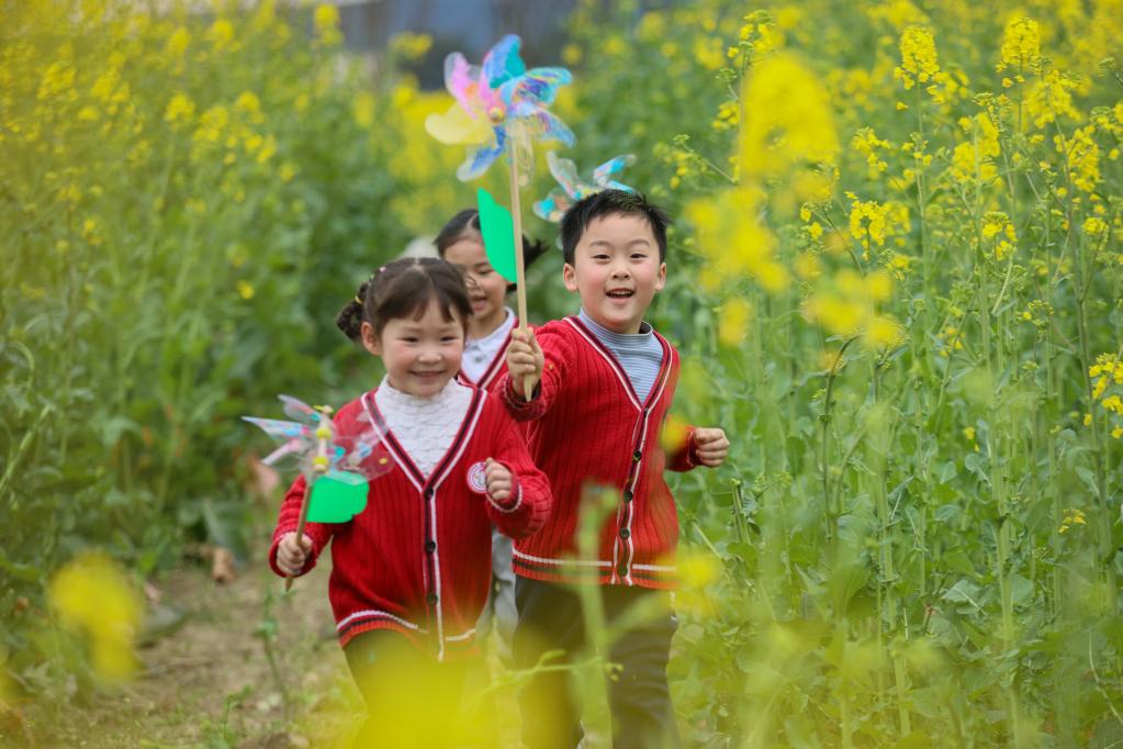 3月4日,四川省遂宁市船山区顺城街幼儿园孩子在油菜花海里奔跑。 新华社发(刘昌松 摄)