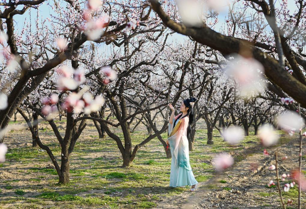 3月20日,游客在安徽省宿州市砀山县玄庙镇杏园里游览拍照。新华社发(崔猛摄)
