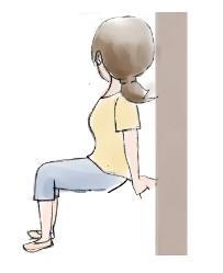 背靠墙,双腿呈90度向下滑到坐姿。双手放在胸前,核心肌肉绷紧。如果觉得动作难度过大,试试降阶锻炼法:大腿与小腿夹角可保持在90至120度之间。