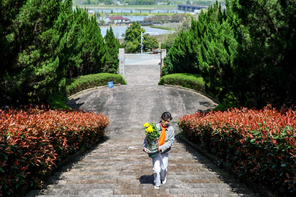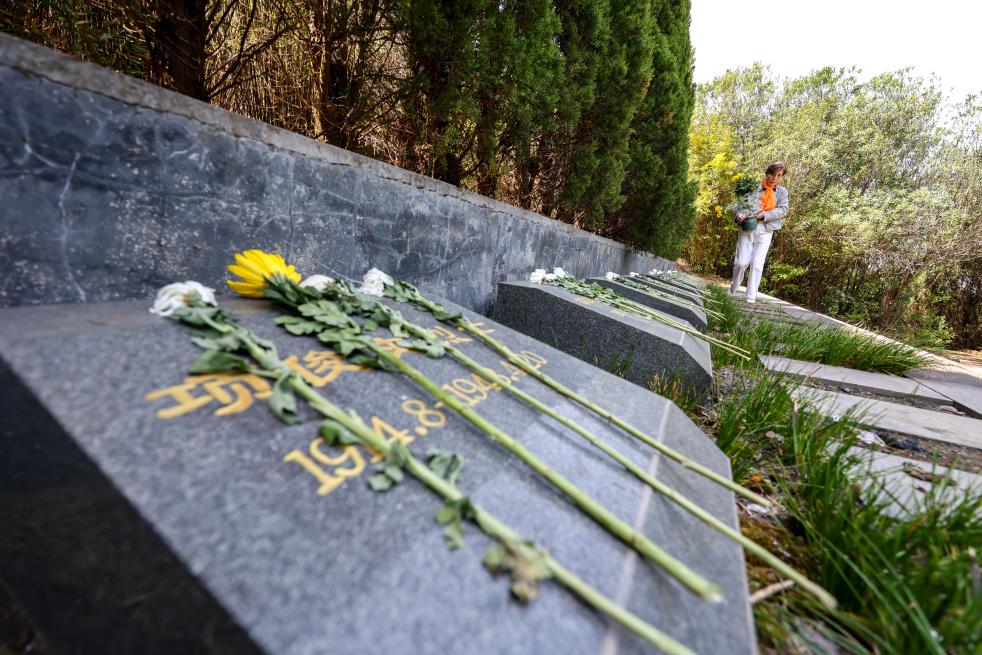 2025年4月2日,在浙江省金华市孝顺革命烈士陵园,雷烨外甥女项碧英前往祭扫雷烨。在孝顺革命烈士陵园,当地政府用雷烨的原名项俊文竖立墓碑。“项俊文”这三个字,永远镌刻在了“孝顺镇革命烈士英名录”的石碑之上。新华社记者 刘金海 摄