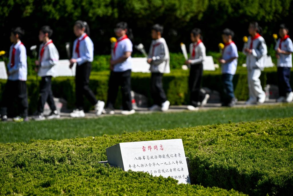 清明节前,河北省平山县雷烨希望小学师生共同缅怀雷烨烈士(2025年3月31日摄)。新华社记者 刘金海 摄