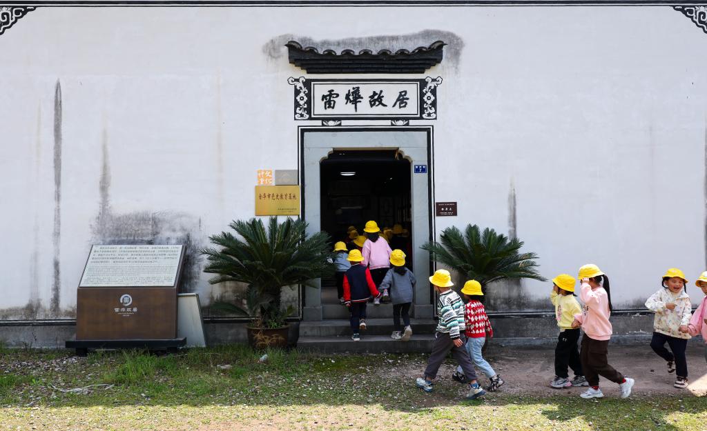 清明节前,当地幼儿园的小朋友们来到浙江省金华市金东区孝顺镇新后项村参观雷烨故居(2025年4月2日摄)。新华社记者 刘金海 摄