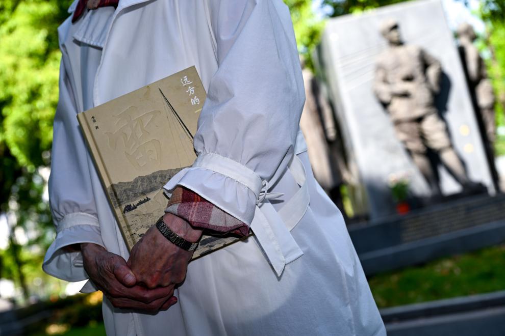 2025年4月14日,在浙江省杭州市,项碧英在浙江展览馆东侧“抗战英烈”雕塑中的雷烨烈士像前,手持报告文学《远方的“雷烨树”》告慰英烈。新华社记者 刘金海 摄