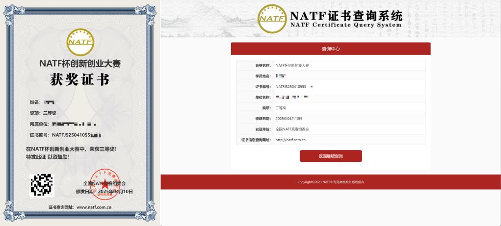 记者向“NATF学术顾问”咨询相关竞赛证书时被告知,只需缴纳280/200/120元,无需参赛,便可直接获得所有“竞赛”的一、二、三等奖证书,而且“官网可查”。而其所谓的“官网”则是“NATF标准化职业技能考试认证职业技能证书查询平台”网站。