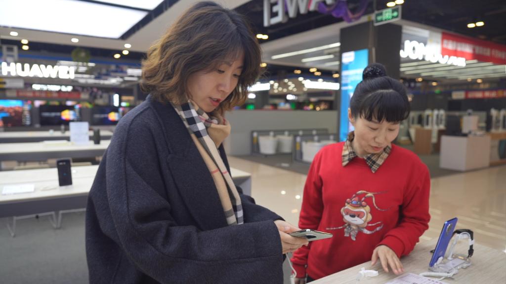 在苏宁易购长春市重庆路万达店,市民宋迪(左)在选购家电产品。新华社记者姜明明 摄