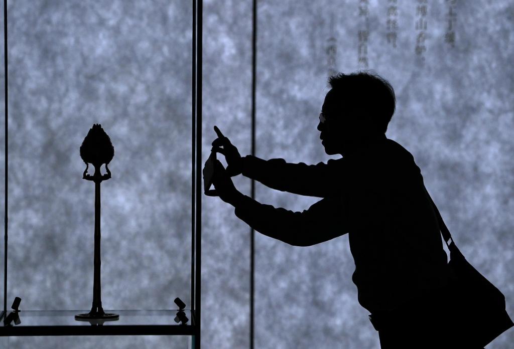 2022年9月4日,参观者在郑州博物馆文翰街馆“繁星盈天——中国百年百大考古发现展”上拍摄展品“镶嵌绿松石兽面纹铜牌饰”。新华社记者 李安 摄