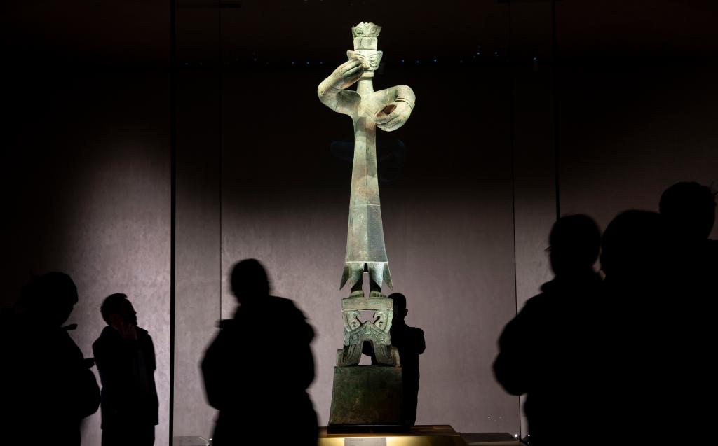 2024年12月18日,观众在三星堆博物馆新馆展厅内参观青铜大立人像。新华社记者 才扬 摄