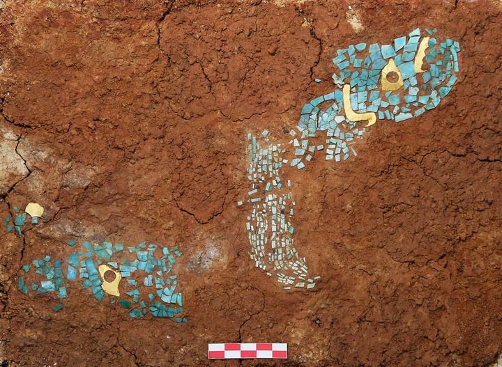 湖北黄陂盘龙城遗址杨家湾M17出土的金片绿松石镶嵌饰(资料照片)。新华社发(全国十大考古新发现活动办公室供图)