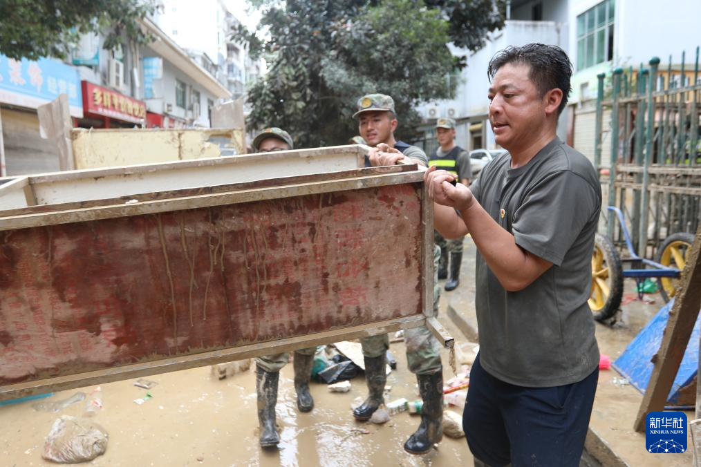 6月29日,在榕江县车民街道文体中心社区,来自岑巩县人武部的党员陈宏祥(右一)与同事为受灾群众清运杂物。新华社发(唐鹏摄)