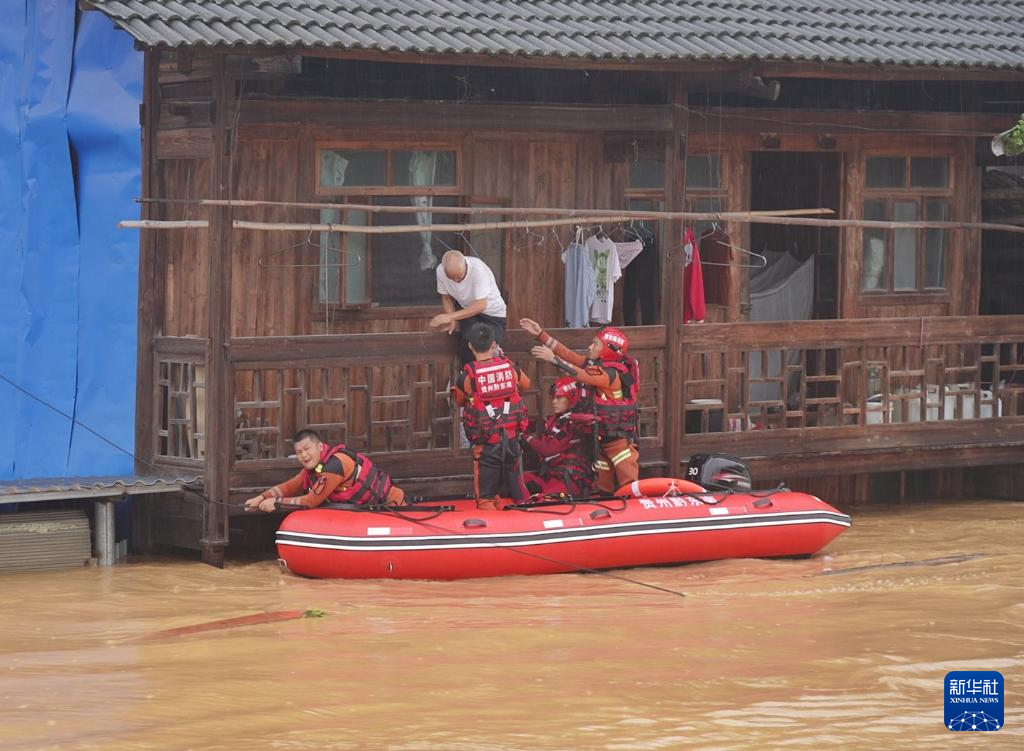 6月24日,榕江县消防队员、党员张齐武(右一)和同事在转移居民。新华社发
