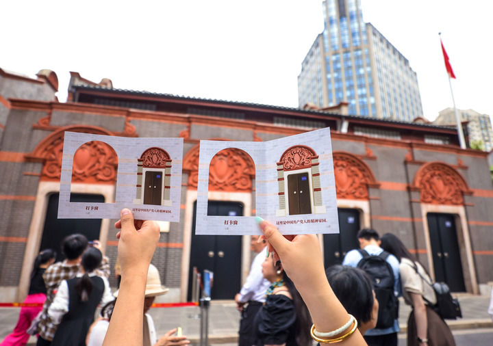 游人手持文创明信片,在中共一大会址前打卡拍照。新华社记者 刘颖 摄