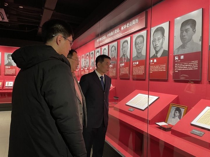 中共四大代表阮章的后人在中共四大纪念馆展陈前。新华每日电讯记者郭敬丹 摄