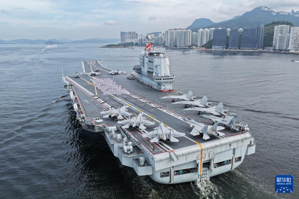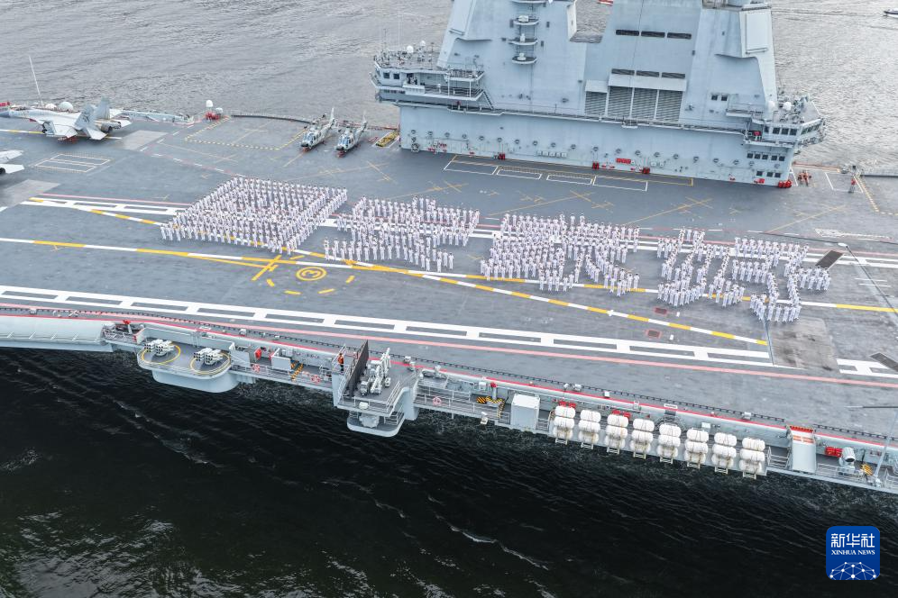 7月3日,中国海军山东舰航母编队抵达香港。这是山东舰官兵在飞行甲板上列队排出“国安家好”字样(无人机照片)。新华社发(蒲海洋 摄)