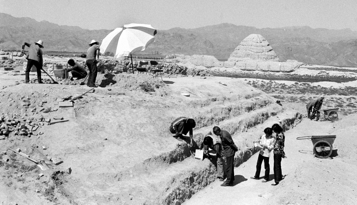1987年,考古人员在发掘西夏陵区3号陵东碑亭遗址。 新华社记者 陈思禹 摄
