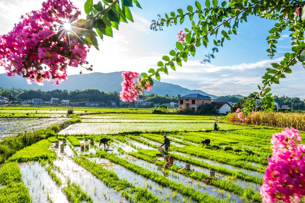 7月21日,农民在湖南省娄底市双峰县荷叶镇长塘村的田间插秧。新华社发(李建新摄)