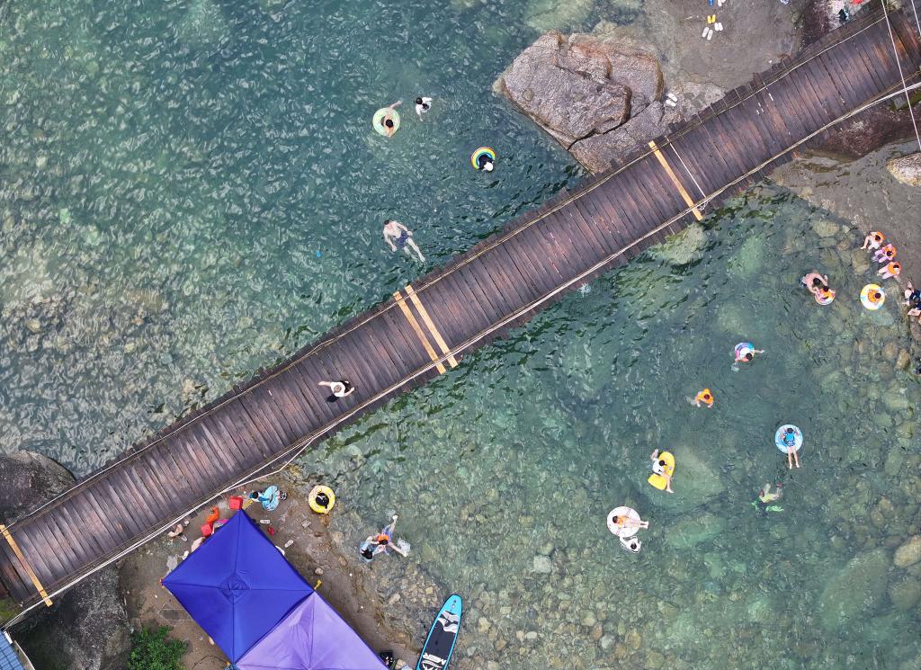 游客在融水苗族自治县香粉乡雨卜村戏水消暑(7月19日摄,无人机照片)。新华社记者 黄孝邦 摄
