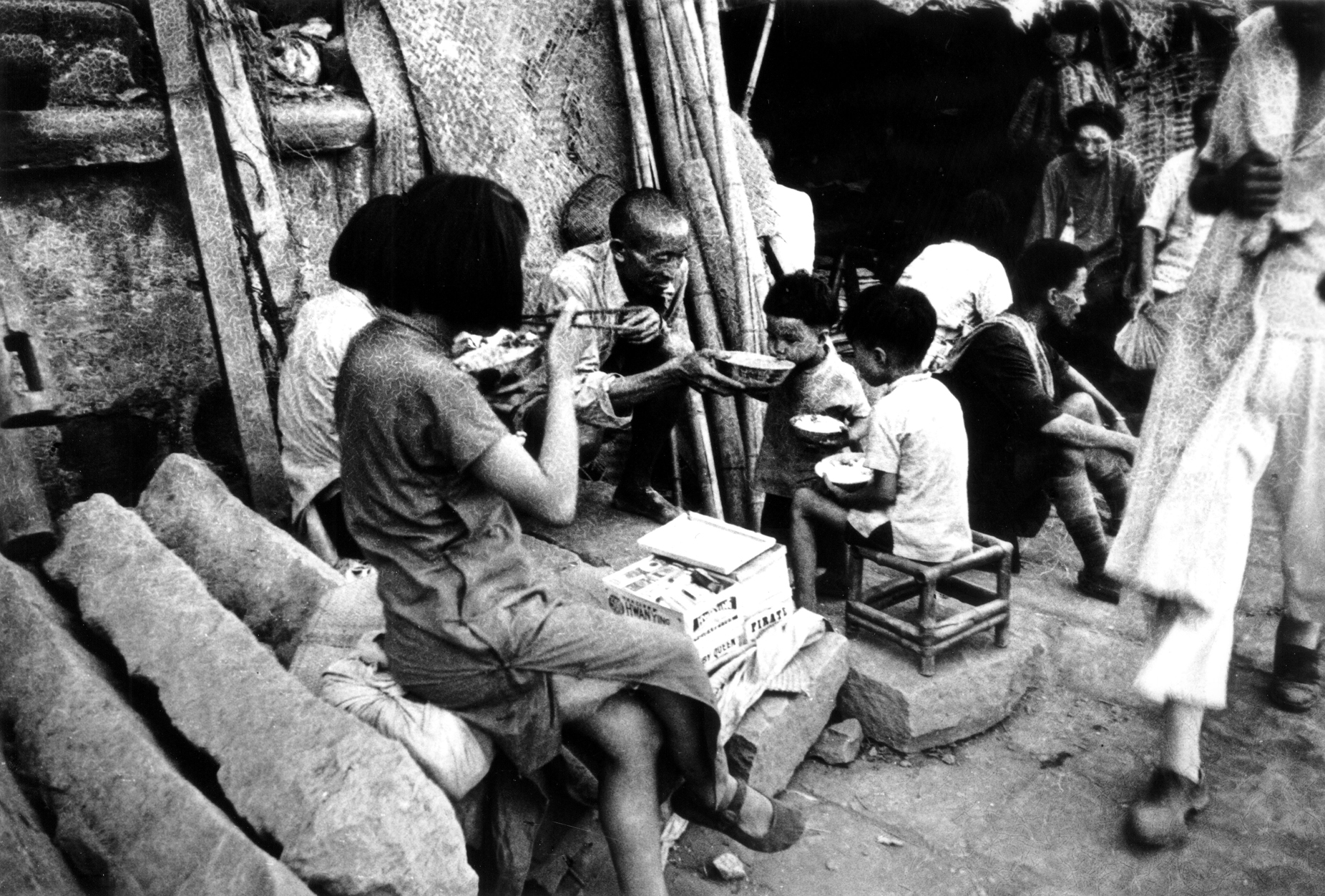 一户人家在敌机离去后,坐在家门口吃饭。资料图