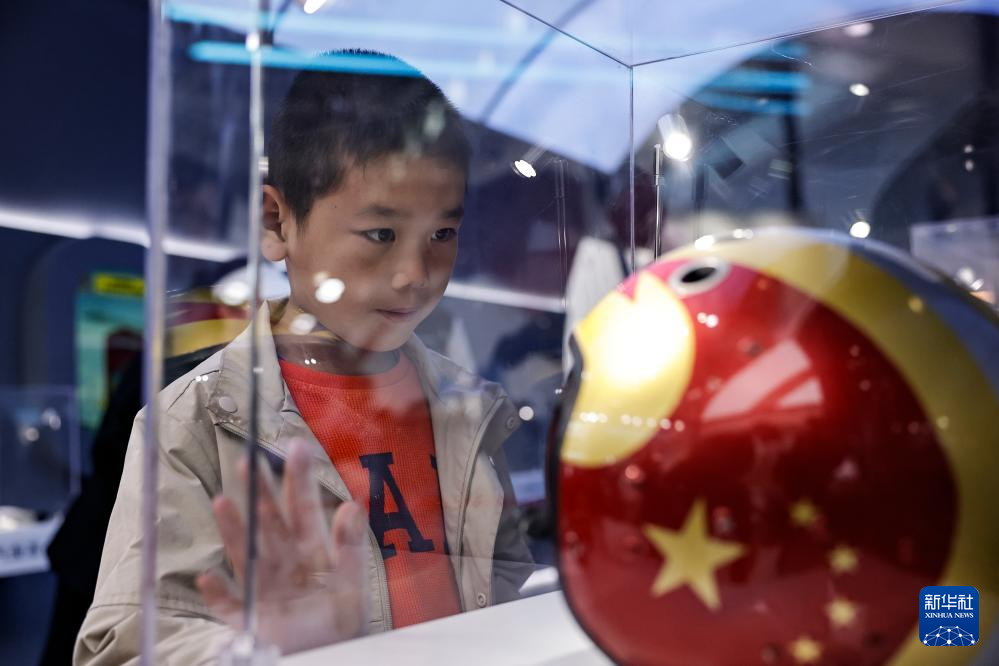 9月22日,在第十一届空军航空开放活动和长春航空展上,一名小朋友参观展品。新华社发(谭巳成 摄)