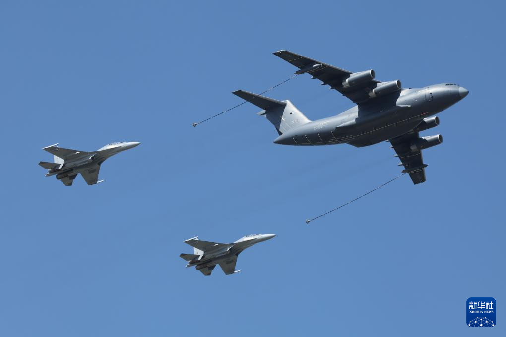 9月23日,在第十一届空军航空开放活动和长春航空展上,运油-20A和歼-16编队通场。新华社发(谭巳成 摄)