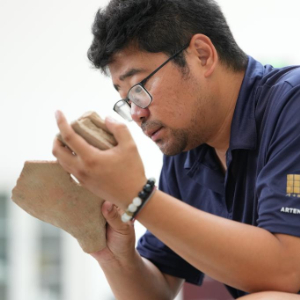 秦咸阳城遗址考古项目负责人、陕西省考古研究院副研究馆员张杨力铮仔细观察考古发掘出的陶片。新华社记者 李一博 摄