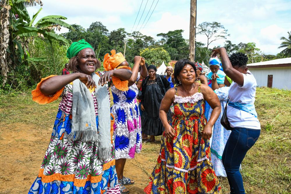 2025年10月8日,在喀麦隆松明比亚斯村,村民庆祝中国企业建设的农村离网太阳能电站项目正式启用。新华社发(科普索摄)