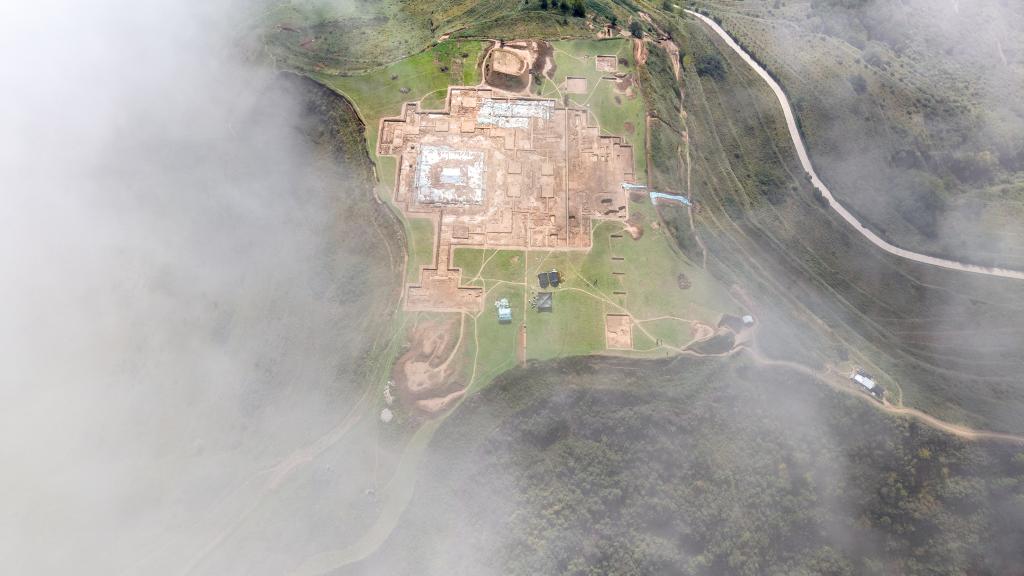 这是10月15日拍摄的甘肃省陇南市礼县四角坪遗址考古发掘现场(无人机照片)。新华社记者 郎兵兵 摄