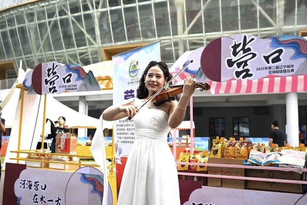 “辽超”场地旁,“辽超市集”营口摊位进行节目演出