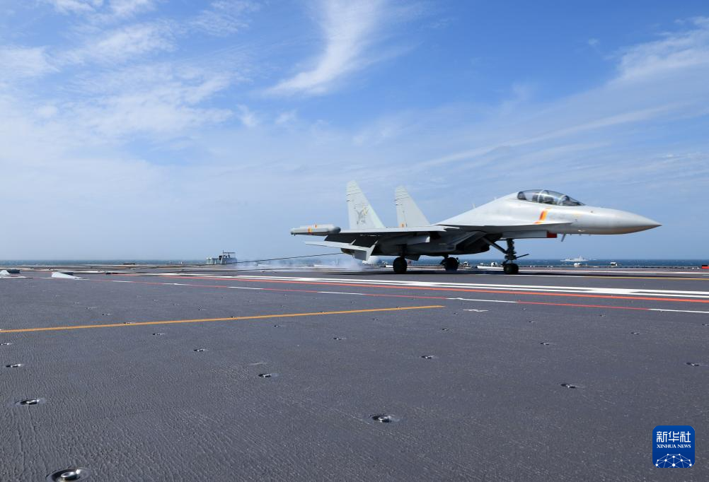 日前,海军福建舰开展入列后首次海上实兵训练。这是歼-15DT舰载机着舰。新华社发(姜超 摄)