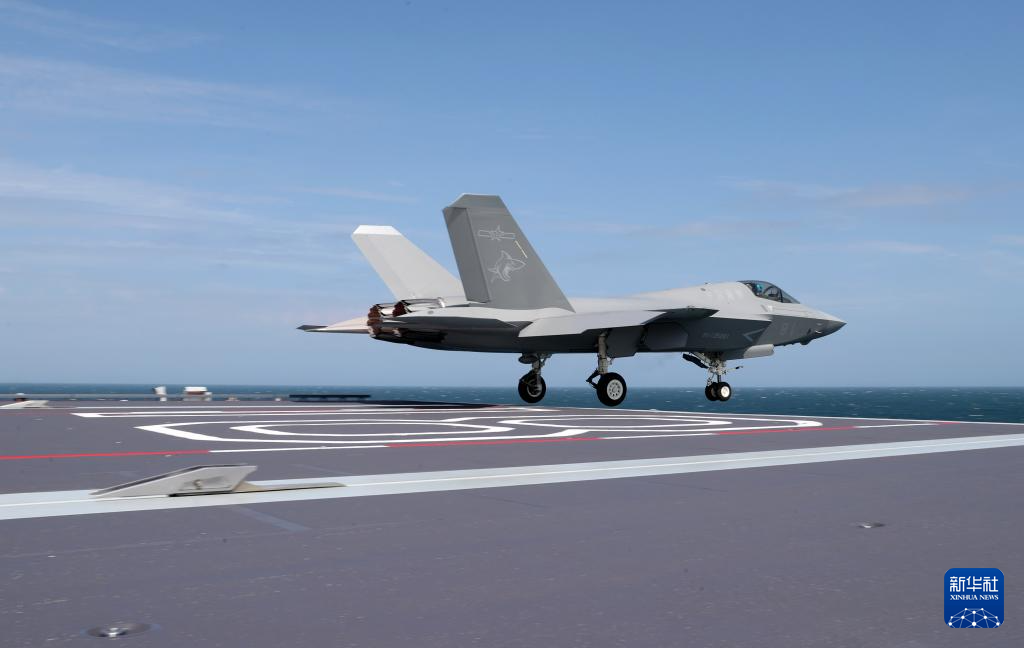 日前,海军福建舰开展入列后首次海上实兵训练。这是歼-35舰载机弹射起飞。新华社发(王健 摄)