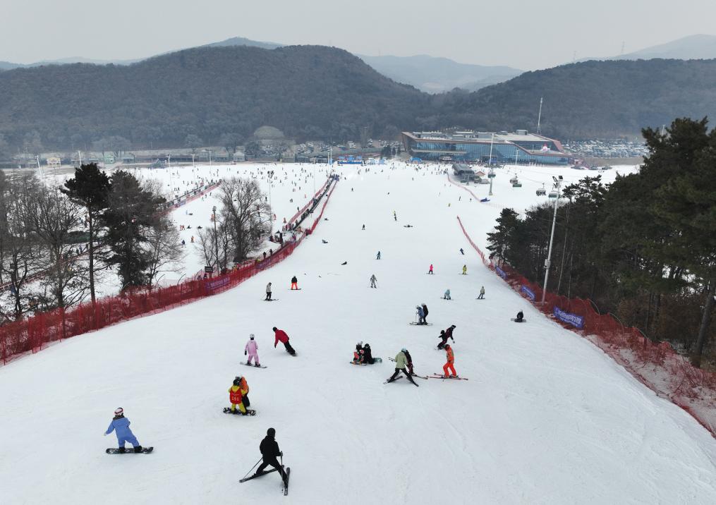 12月6日,滑雪爱好者尽情享受雪季(无人机拍摄)。周末,沈阳东北亚国际滑雪场迎来众多滑雪爱好者。新华社记者 李钢 摄