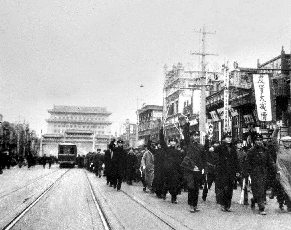 北平学生高呼“反对华北自治,争取民族解放”等口号向天桥集合(资料照片)。