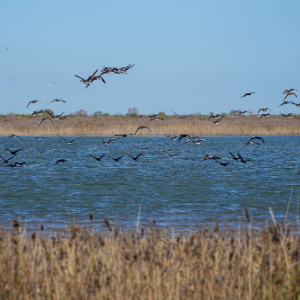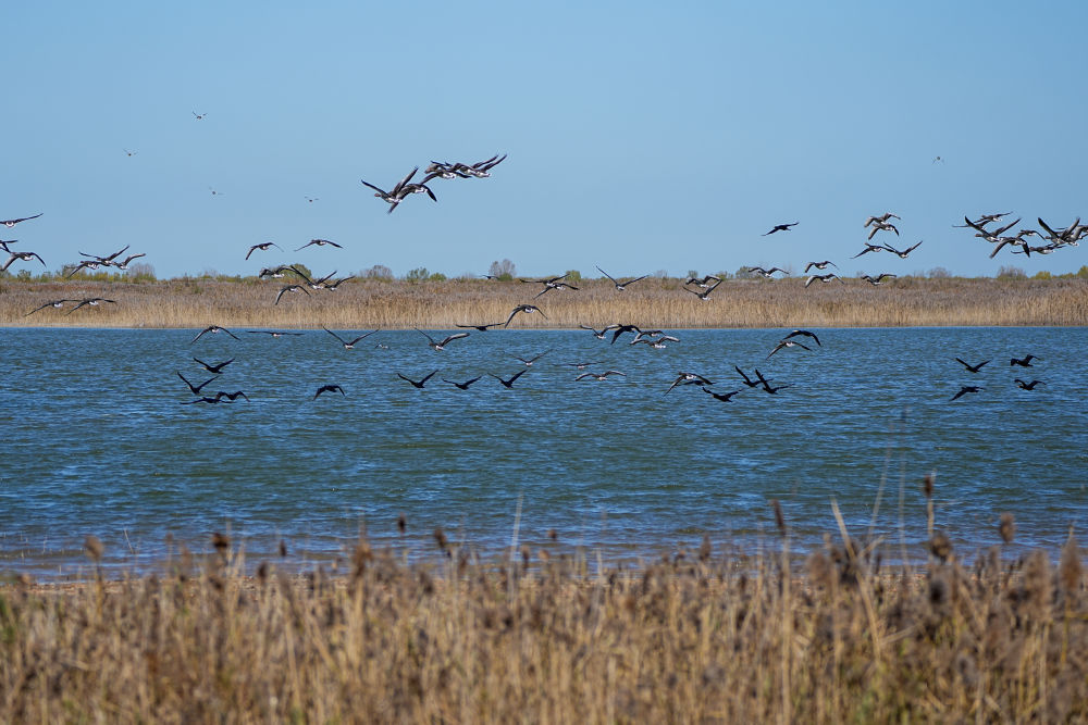 2025年11月13日,越冬候鸟在山东黄河三角洲国家级自然保护区飞翔。新华社记者 朱峥 摄