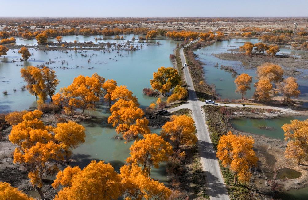 游客在新疆尉犁县罗布淖尔国家湿地公园自驾观光(2023年11月4日摄)。新华社记者 王菲 摄