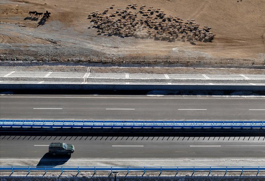 在新疆和静县,牧民骑马赶着羊群行进在乌尉高速公路旁(2025年12月23日摄)。新华社记者 王菲 摄
