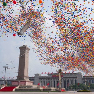 2025年9月3日,纪念中国人民抗日战争暨世界反法西斯战争胜利80周年大会在北京隆重举行。这是天安门广场放飞气球和鸽子。新华社记者 江文耀摄