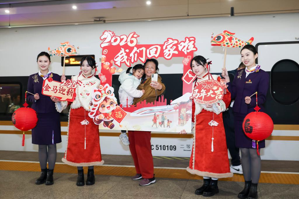 2月2日,在上海虹桥火车站,旅客和铁路上海客运段乘务员在G14列车外打卡合影。新华社记者 王翔 摄