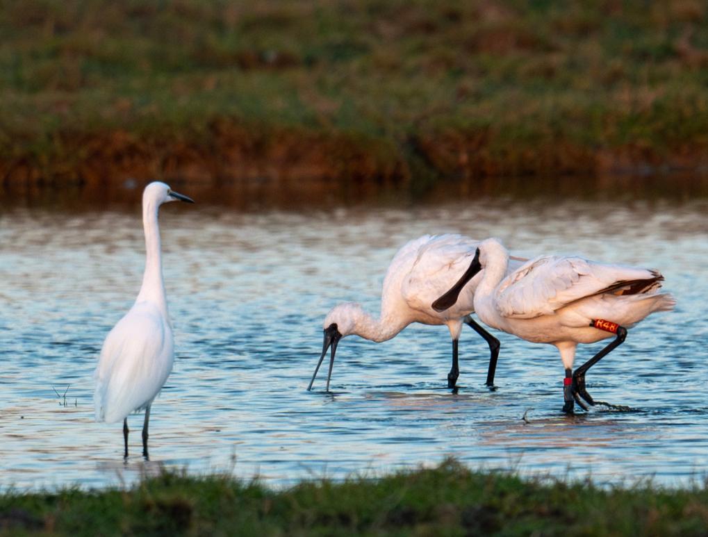 编号“R48”的黑脸琵鹭(右一)在浅水塘里觅食。新华社发(杨川 摄)