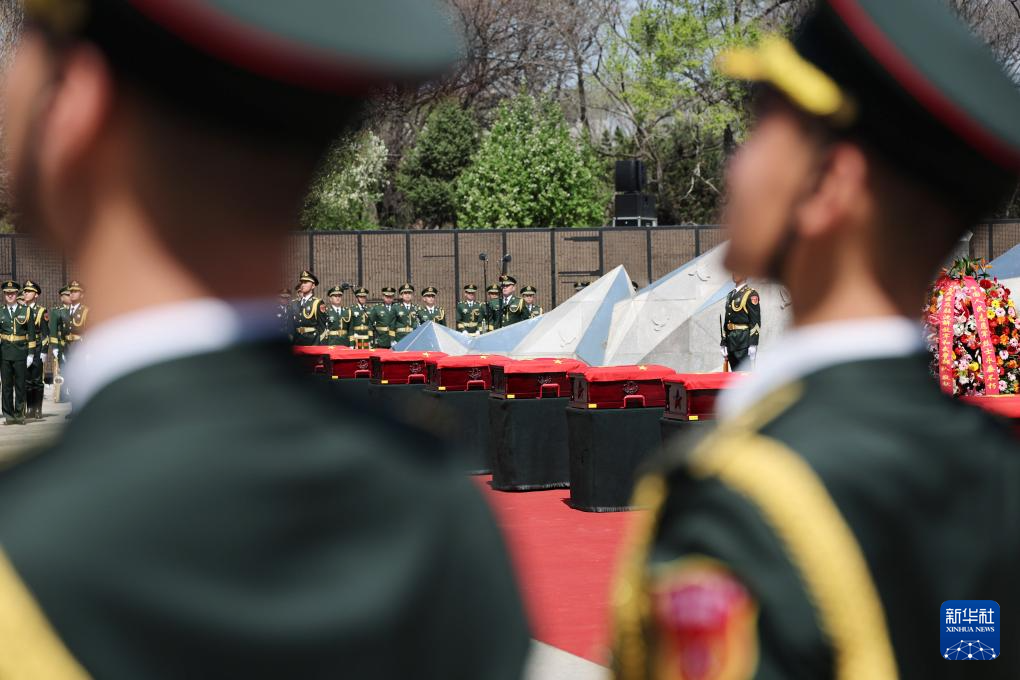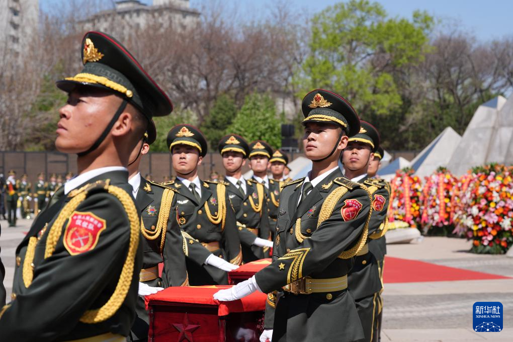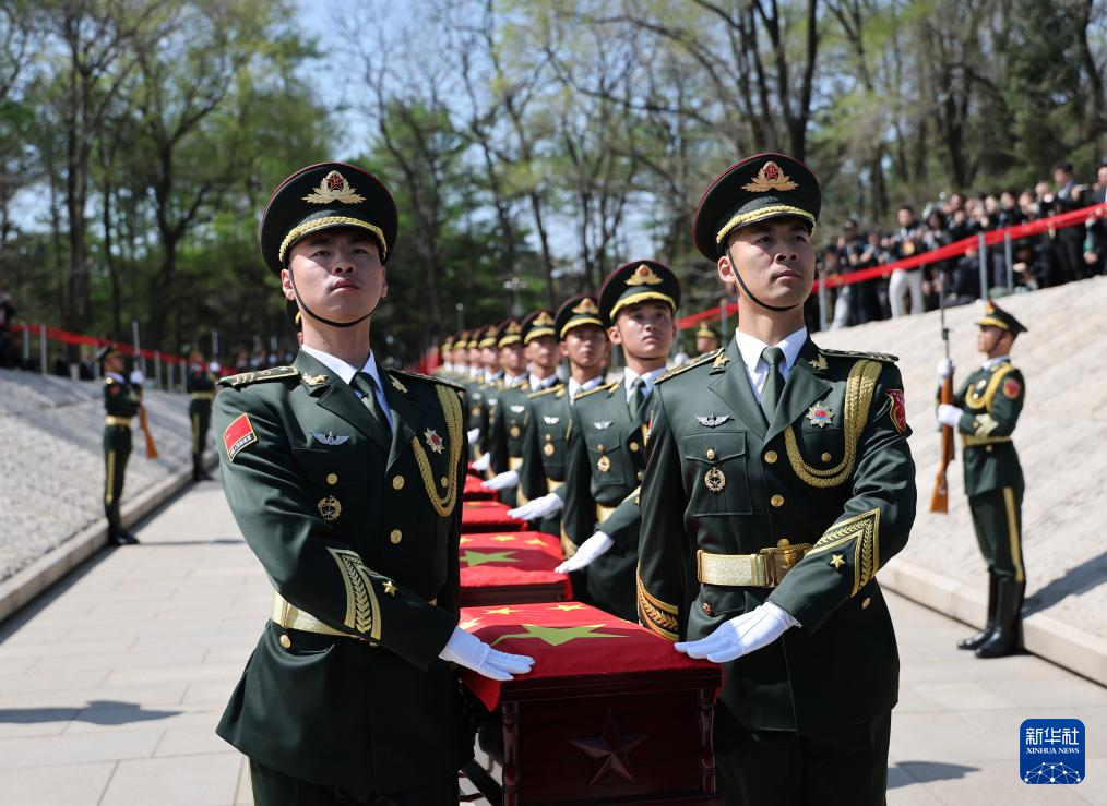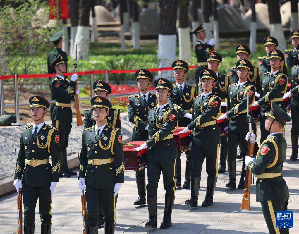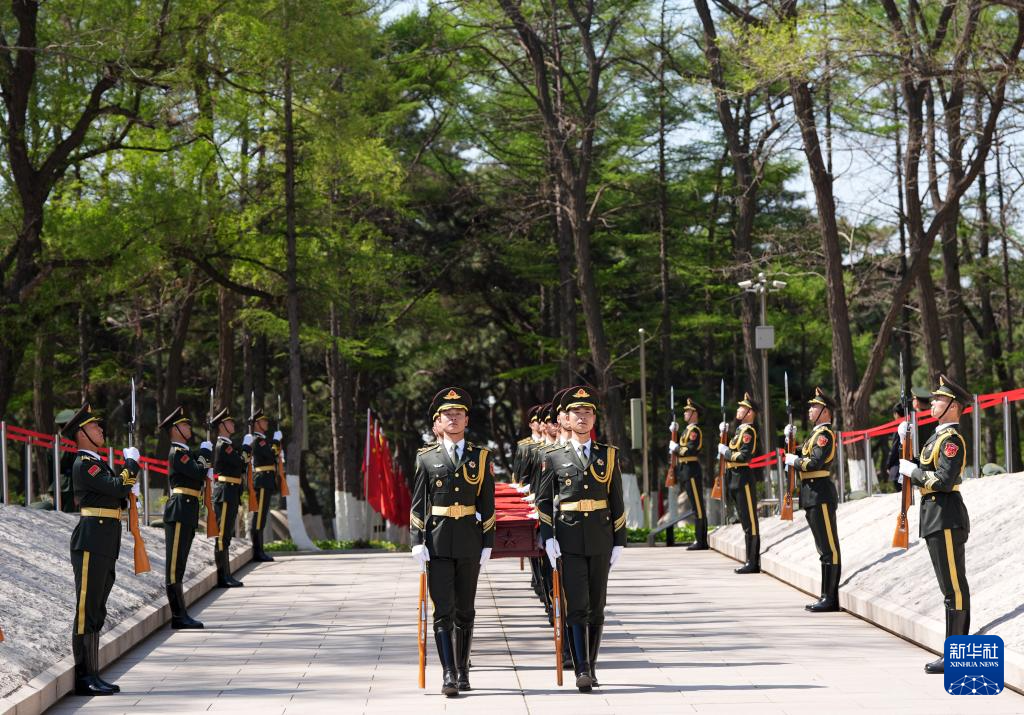 4月23日,礼兵护送志愿军烈士遗骸棺椁就位。新华社记者 韩赫 摄