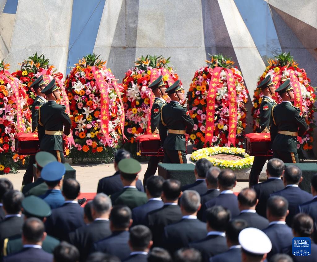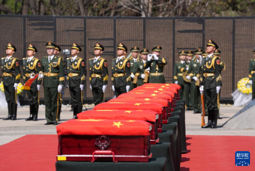 4月23日,在沈阳抗美援朝烈士陵园,志愿军烈士棺椁摆放在纪念广场。新华社记者 李钢 摄