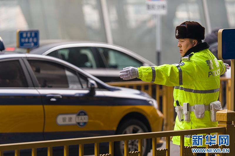 1月30日,北京南站南广场落客区正式启用,全面向社会车辆开放落客功能。北京铁路公安处交通管理支队民警正在疏导交通。新华网记者 钟奕摄