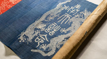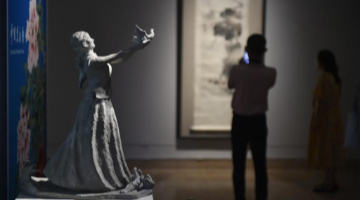 7月17日,解放军文工团雕塑创作员郎钺在擦拭雕塑。