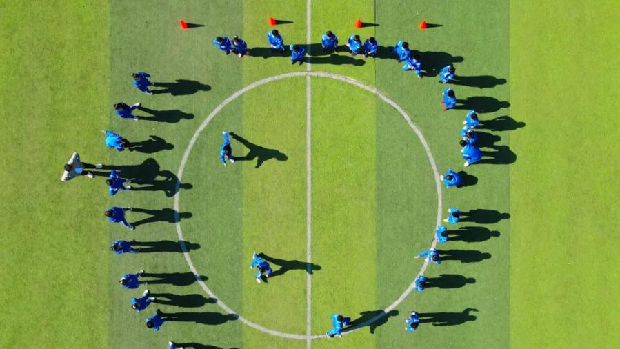 ▲学生在操场上进行体育课程展示(无人机照片)。新华社记者 魏培全 摄