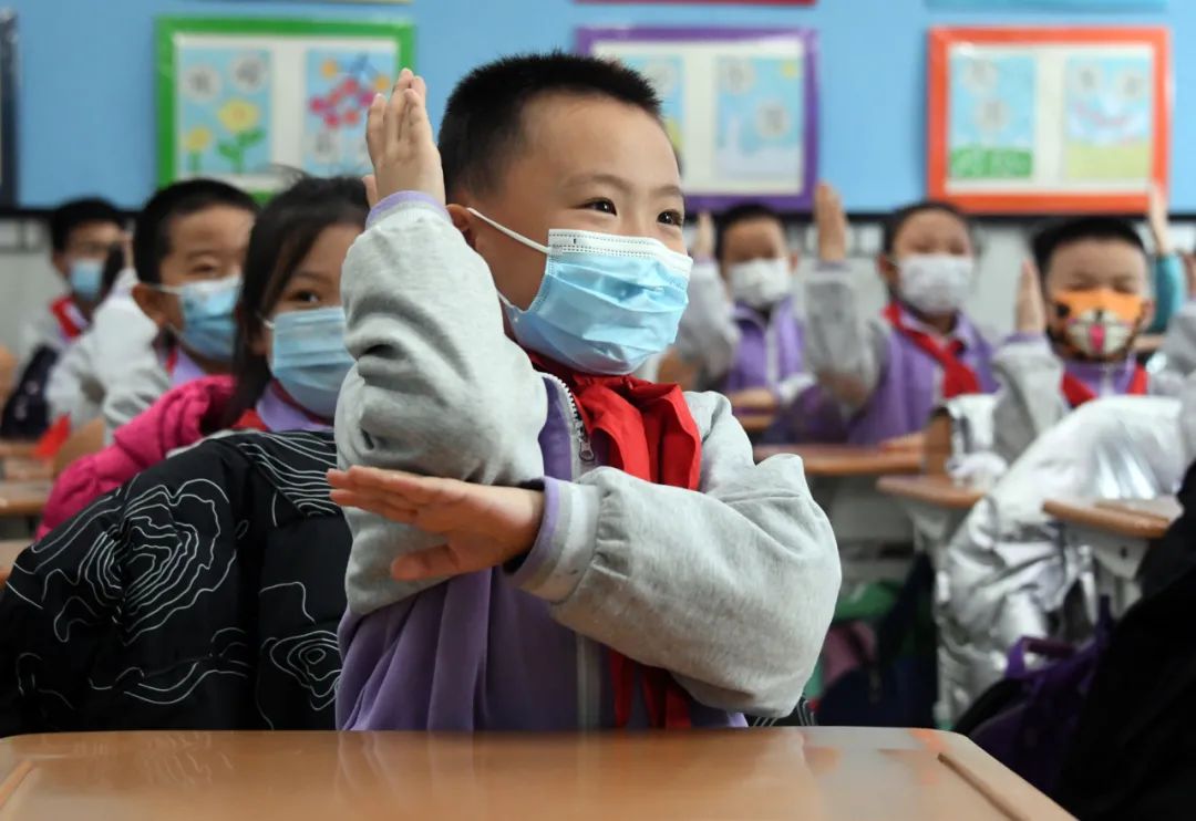 ▲2月21日,在北京市海淀区双榆树第一小学,二年级(2)班的学生在数学课上举手回答问题。新华社记者 任超 摄