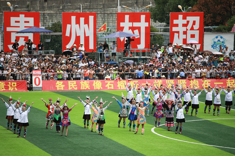 贵州榕江美食足球友谊赛开赛 演员在比赛间隙进行表演 新华社记者 刘续 摄