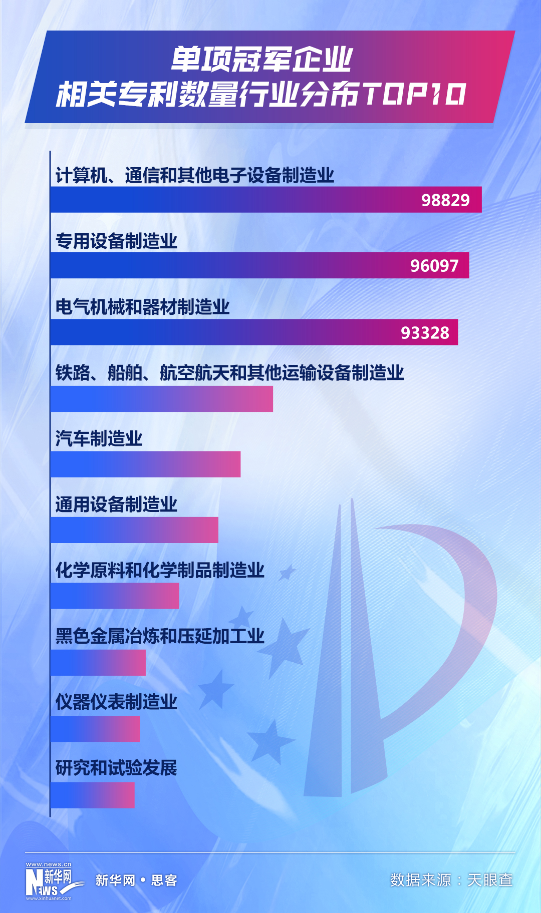 近年来,“单项冠军企业”研发投入持续增长,创新成果质量显著提升,有37家单项冠军企业专利申请超5000项。从专利数量的分布来看,200项到500项专利区间范围内的企业,数量超360家。从专利的行业分布来看,计算机、通信和其他电子设备制造业、专用设备制造业、电气机械和器材制造业,这三个行业的专利申请数量位居前列,均超过9万项。